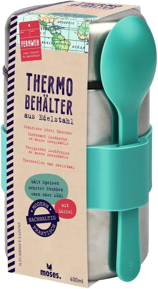 | Item Type Name | moses. Fernweh thermal container for food - warming container turquoise made of stainless steel, vacuum insulated lunch box for on the go, thermal container with 400 ml capacity and spoon, leak-proof and tasteless |